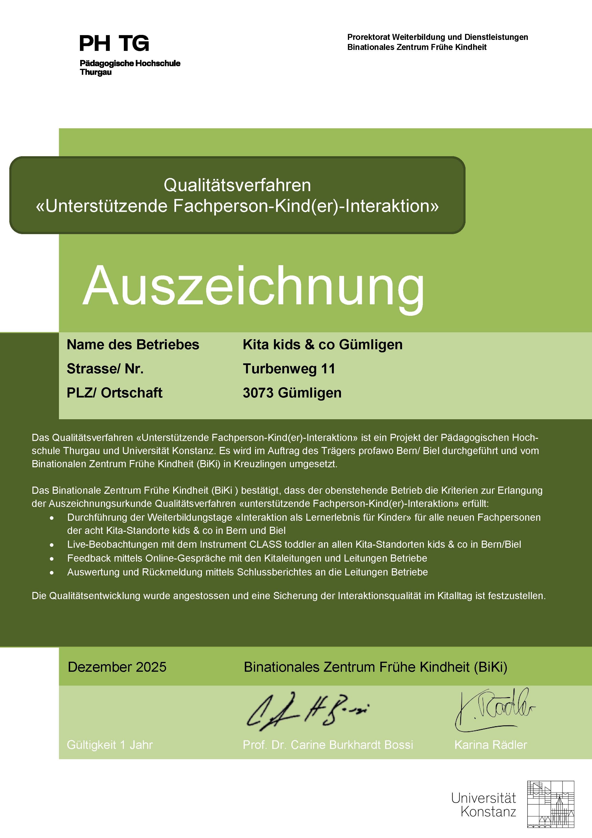 The daycare centre is also ideal for working parents: thanks to its proximity to Bern and flexible care models, it is a reliable solution for balancing family and career in the greater Bern area.