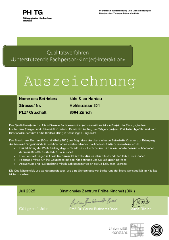 «Ernährungsbewusste und bewegungsfreundliche Kindertagesstätte» bestätigt von Prävention & Gesundheitsförderung Kanton Zürich